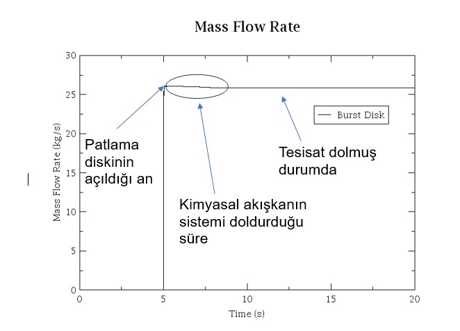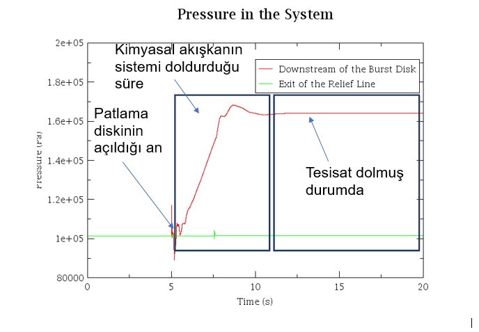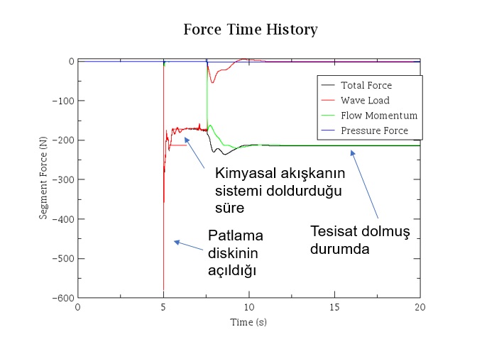 Örnek olarak 20 m uzunluğunda DN80 çapında bir basınç emniyet sistemini ele alalım. Örnek problemde patlama diskinin 5. saniyede açıldığını göz önüne alalım. RELAP5 ile yapılan sonuçları inceleyelim. Şekil 3’te sistemdeki kütle akış miktarının zamana bağlı değişimi verilmektedir. Benzer olarak Şekil 4’te sistemdeki basınç dağılımı gösterilmektedir. Son olarak da boru hattı üzerindeki tepki kuvvetleri hesaplanarak şekil 5’te olduğu gibi gösterilebilir.
